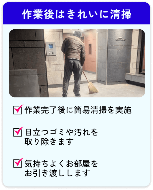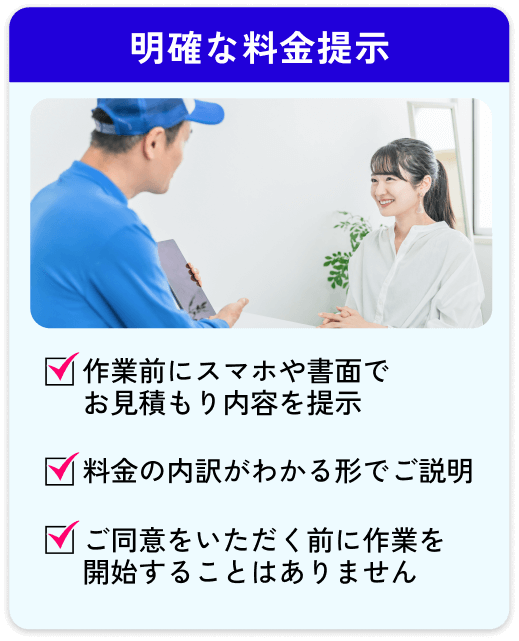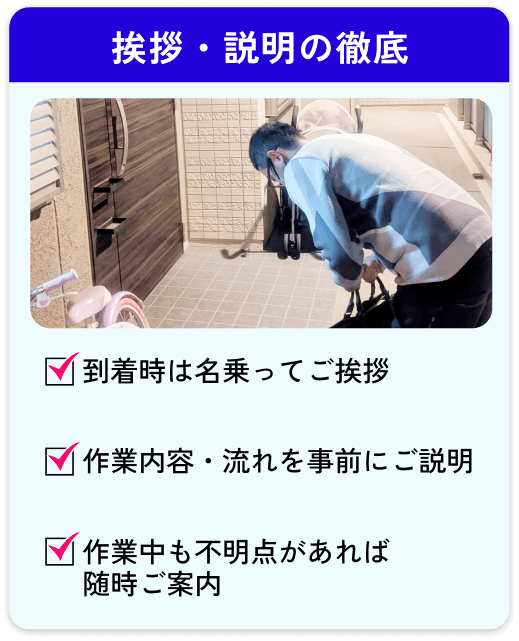 【当社が大切にしていること】 見積もり後に金額が変わらない / 不明点をその場でしっかり説明 / 無理な営業・強引な契約は一切なし